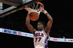 接著,在賈巴里-沃克補籃得手后,埃奇庫姆命中了他個人的第三記三分球,在比賽還剩1分14秒時將比分追至25平。在首節(jié)比賽中,76人最后的16分里有13分是由他得到的。
