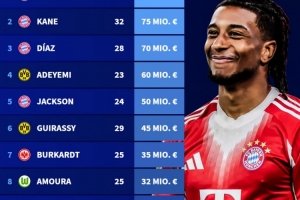3、路易斯-迪亞斯(拜仁):7000萬歐元