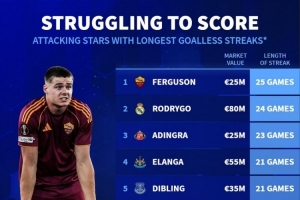 體育資訊10月25日訊 德國轉(zhuǎn)會市場盤點了進(jìn)攻球員進(jìn)球荒場次,并列出榜單,埃文-弗格森25場,羅德里戈24場。