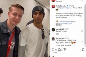 巴黎邊衛(wèi)阿什拉夫來(lái)到伯納烏,觀看了這場(chǎng)國(guó)家德比,見(jiàn)證老東家取勝,球迷社媒曬出與阿什拉夫的合照。