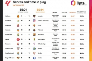 本輪西甲凈比賽時長最多的是馬洛卡vs萊萬特,為59分17秒;凈比賽時長最短的則是巴列卡諾vs阿拉維斯,僅48分31秒。