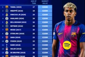 體育資訊10月29日訊 德轉(zhuǎn)盤(pán)點(diǎn)了歷史上身價(jià)最高的30名球員,歷史上共有四名球員達(dá)到過(guò)2億歐元里程碑,分別是亞馬爾(2025年,17歲)、姆巴佩(2018年,19歲)、維尼修斯(2024年,24歲)和哈蘭德(2024年,24歲)。