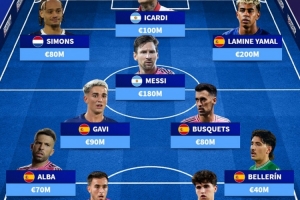 前鋒:哈維-西蒙斯(8000萬歐)、伊卡爾迪(1億歐)、亞馬爾(2億歐)
