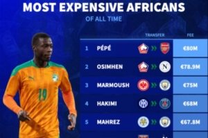 體育資訊7月20日訊 德轉(zhuǎn)網(wǎng)站統(tǒng)計(jì)了非洲球員的最高轉(zhuǎn)會費(fèi),佩佩從里爾加盟阿森納的8000萬歐元居首,具體情況如下: