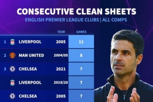 英超球隊(duì)最長(zhǎng)零封榜:阿森納當(dāng)前6場(chǎng)列第10 ,05年利物浦11場(chǎng)居首
