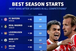 體育資訊10月31日訊 拜仁在昨晚德國杯4-1逆轉(zhuǎn)科隆,賽季開局各項賽事14場全勝打破五大聯(lián)賽球隊歷史紀(jì)錄,《轉(zhuǎn)會市場》也統(tǒng)計了五大聯(lián)賽球隊歷史單賽季各項賽事前14場的勝場情況。