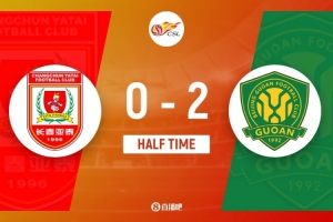 傷停補(bǔ)時(shí)7分鐘。上半場(chǎng)比賽結(jié)束,長(zhǎng)春亞泰0-2北京國(guó)安。