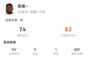 體育資訊11月3日訊 意甲第10輪比賽,萊奧送出助攻,幫助米蘭主場1-0擊敗羅馬。