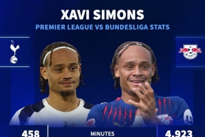 體育資訊11月4日訊 德國(guó)轉(zhuǎn)會(huì)市場(chǎng)統(tǒng)計(jì)了熱刺新援哈維-西蒙斯在德甲和英超的數(shù)據(jù),并做出對(duì)比。