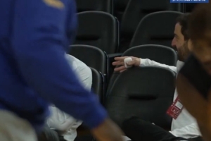 有人拍到鄧利維的經(jīng)紀人與勇士總經(jīng)理鄧利維在場邊聊天,而庫明加在鏡頭近景訓練。
