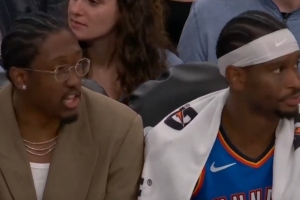 比賽最后時(shí)刻,鏡頭給到板凳席上的雷霆眾將,亞歷山大和仍在養(yǎng)傷的杰倫·威廉姆斯神同步。