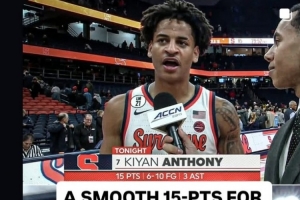體育資訊11月5日訊 在昨天的一場NCAA比賽中,雪城大學(xué)85-47大勝賓漢頓大學(xué)??仿 ぐ矕|尼之子基揚(yáng)·安東尼完成了大學(xué)正式比賽的首秀。