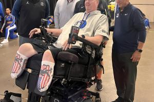 體育資訊11月06日訊 前NBA球員、53 歲的“大竹竿”肖恩·布拉德利今日坐輪椅觀戰(zhàn)獨(dú)行俠,并與他的獨(dú)行俠前隊(duì)友波派·瓊斯聊天。