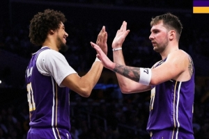 賽后湖人官方曬出本場贏球海報,東契奇和海斯擊掌照登上封面。