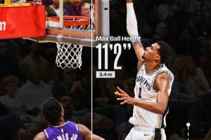 不過在比賽中,他仍有十佳球表現(xiàn)。NBA官方發(fā)布了他隔扣布朗尼一球的兩項數(shù)據(jù),其中球的最高點達到了3.4米,而文班亞馬這一扣的滑行距離達到2.2米。