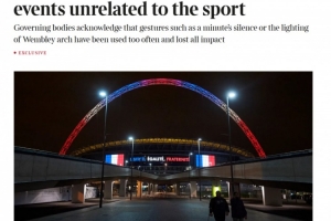 英足總、英超聯(lián)賽和英格蘭足球聯(lián)賽成立了“世界事件工作組”(WEWG),以指導英格蘭足球對重大世界事件的反應。除非事件與足球有直接關聯(lián),否則聯(lián)賽將不會舉行默哀儀式,也不會點亮溫布利球場的拱門。