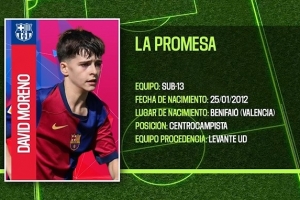 大衛(wèi)-莫雷諾是巴薩青訓(xùn)營(yíng)中最具潛力的球員之一。上賽季,他成為了巴薩所有11人制球隊(duì)中最耀眼和最令人矚目的球員。這名左腳中場(chǎng)將在明年1月25日年滿14歲,2023-24賽季從萊萬特加盟后,他已經(jīng)在巴薩青訓(xùn)營(yíng)度過了兩個(gè)輝煌的賽季。