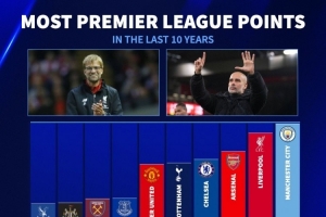 英超近10年總積分排名:曼城847分居首,利物浦、阿森納二三位