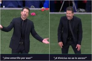 在一次犯規(guī)判罰之后,鏡頭拍到了馬競主帥西蒙尼正在對主裁曼薩諾抗議:“嘿!你在吹什么!冷靜點!就為了這個出牌?”西蒙尼最后又搖著頭說:“你不敢對維尼修斯出牌?!比缓笏侄⒅谒墓賳T重復(fù)了一遍這句話。