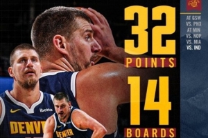 32+14+14!掘金發(fā)布約基奇數(shù)據(jù)海報:這些都是32分鐘里做到的??