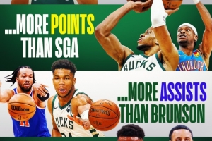 美媒Clutchpoints列出了有趣的對(duì)比,比得分字母哥場(chǎng)均得分高于亞歷山大的33分,比助攻多過布倫森的6.1次,比三分命中率他比庫里的38.9%要高(字母哥場(chǎng)均出手為1.6次)。