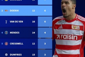 本賽季五大聯(lián)賽后衛(wèi)進(jìn)球榜:格里馬爾多7球居首,范德芬6球次之