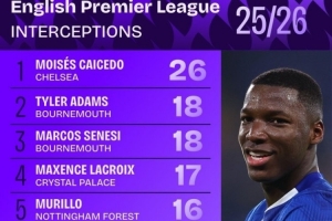 體育資訊11月11日訊 英超聯(lián)賽已經(jīng)進行了11輪,squakwa也統(tǒng)計了本賽季英超攔截次數(shù)情況,凱塞多獨自領(lǐng)跑。