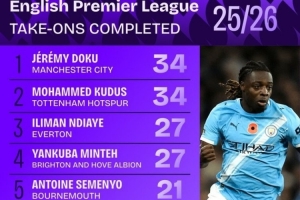 本賽季英超成功過人榜:多庫、庫杜斯并列居首,內(nèi)托、薩卡在列