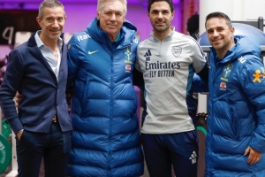 巴西隊(duì)在阿森納基地訓(xùn)練,安切洛蒂與阿爾特塔合影