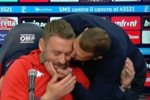 賽后德羅西舉行了新聞發(fā)布會(huì),而就在他接受采訪時(shí),佛羅倫薩前鋒哲科進(jìn)入發(fā)布會(huì)現(xiàn)場(chǎng),并且抱住德羅西連親幾口,哲科還說(shuō)“祝你好運(yùn)”。哲科和德羅西過(guò)去曾是羅馬隊(duì)友,兩人關(guān)系很好,盡管這次作為對(duì)手相遇,但哲科還是以這種方式和德羅西打招呼。