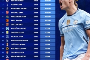 體育資訊11月12日訊 德國轉(zhuǎn)會市場盤點(diǎn)了英超各隊歷史身價最高球員,哈蘭德以2億歐居首,阿扎爾、凱恩、薩拉赫和薩卡均為1.5億歐。