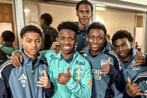 維尼修斯隨巴西隊(duì)在阿森納基地訓(xùn)練,備戰(zhàn)這場(chǎng)友誼賽,他與阿森納的青訓(xùn)球員合影。
