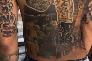 體育資訊7月22日訊 據(jù)美媒Courtside Buzz報(bào)道,南蘇丹后衛(wèi)卡里克-瓊斯把奧運(yùn)會(huì)上同詹姆斯交手時(shí)的合影紋在了后背上。