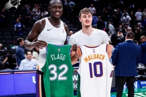 賽后,獨(dú)行俠狀元秀弗拉格和太陽首輪10號秀馬盧阿奇交換球衣。