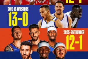 開賽13場后,雷霆以12勝1負的戰(zhàn)績追平了96公牛的同期紀錄,在杰倫·威廉姆斯因手腕傷勢持續(xù)缺陣的情況下,雷霆在13場比賽中凈勝對手202分,場均凈勝分高達驚人的15.5分。
