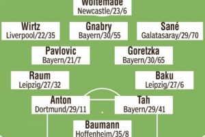 中場:帕夫洛維奇(拜仁)、格雷茨卡(拜仁)、維爾茨(利物浦)、格納布里(拜仁)、薩內(加拉塔薩雷)