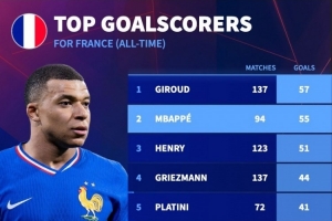 體育資訊11月14日訊 世預(yù)賽歐洲區(qū)比賽,姆巴佩梅開二度,法國主場(chǎng)4-0擊敗烏克蘭。姆巴佩為法國隊(duì)攻入55球,差2球追平隊(duì)史射手王吉魯。