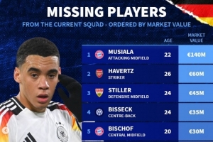 德國(guó)落選本期國(guó)家隊(duì)球員身價(jià)榜:穆西亞拉1.4億歐居首 哈弗茨第二