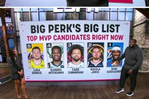 體育資訊11月15日訊 評(píng)論員帕金斯在節(jié)目中給到了自己的賽季至今的MVP名單前五球員。他把亞歷山大排在了第一位,約基奇排在了第二位,康寧漢姆放在了第三位。